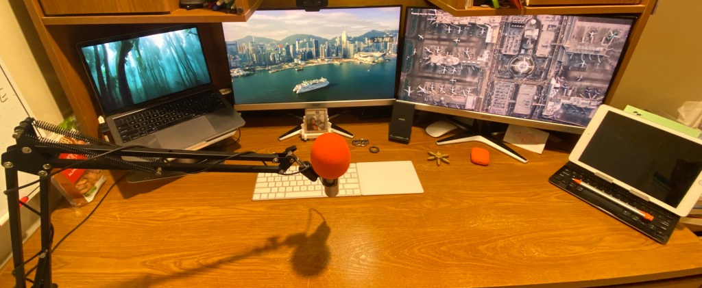Here’s what the setup looks like from where I sit (although you can’t see the lighting well – details below on that as there’s a ring light above the center monitor and a light on the right and the left – cameras love lots of light after all).
