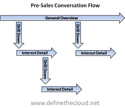 In the diagram above you can see the way the conversation should go with a customer. You begin at the top level big picture and drill down into only the points that the customer shows an interest in or are applicable to their data center and job role. Don’t ever feel the need to discuss every feature of a product or solution because they are not all relevant to every customer. For instance a server admin probably doesn’t care how fast switching occurs but network and application teams probably do. Maybe your product can help save a ton of cost, great but that’s probably not very relevant to the administrators who aren’t responsible for budget. Always ensure you’re maintaining relevance to the audience and the business.