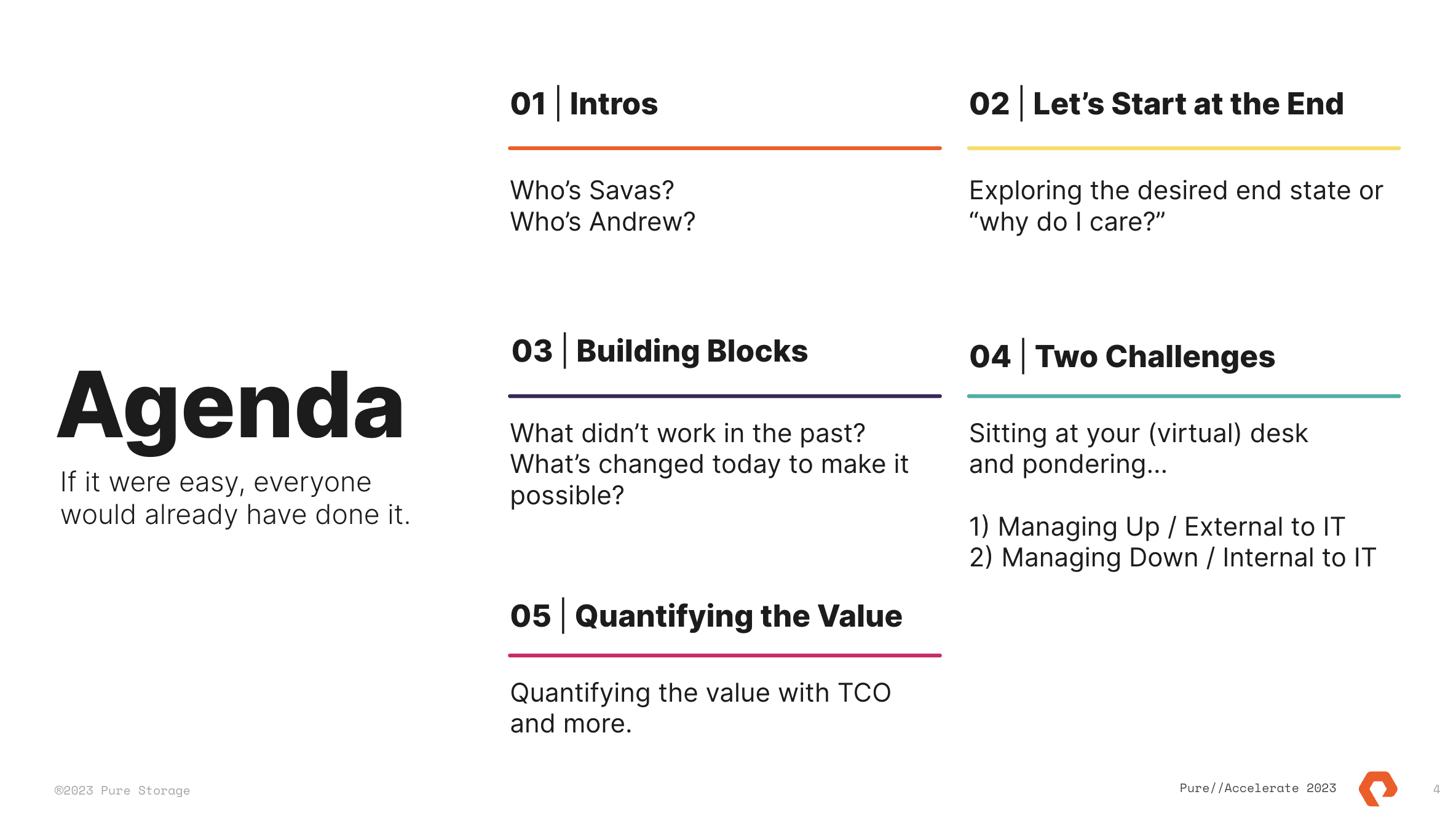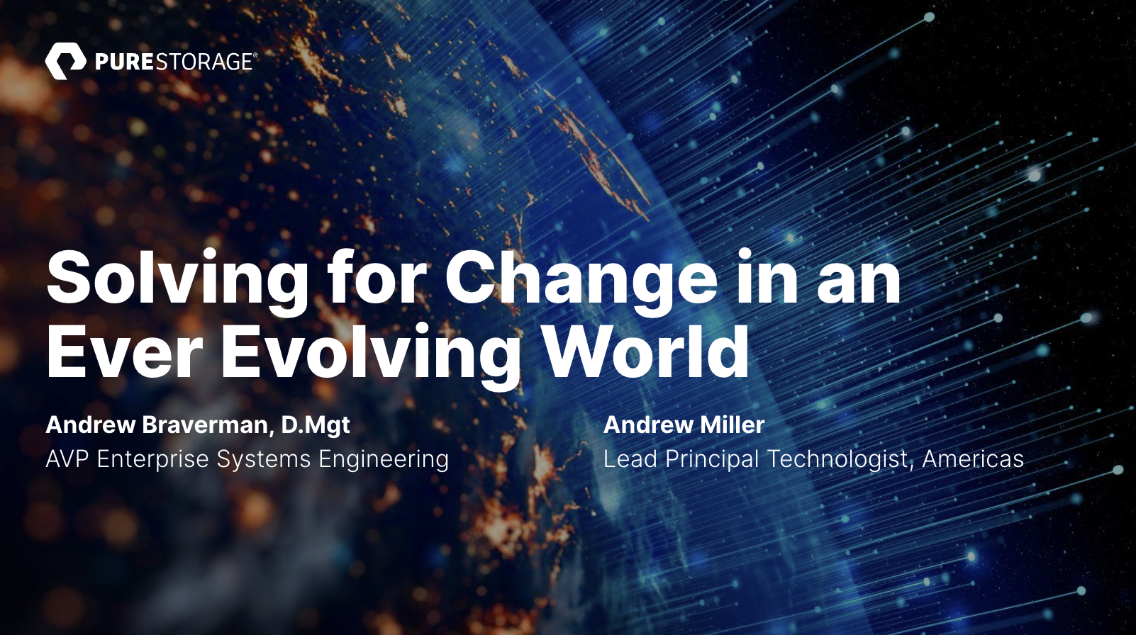 We won’t discuss Pure as much as provide ways to look at the technology and business landscape – ways that we’ve leveraged over the years, that we think will help our customers, and that will also be useful to our customers. Call it a bit of an MBA course or TED Talk with interesting stories and IT relevance if you will. To finish up, JD Wallace, Santiago Navonne, Mayank Bhatnagar, and myself will be on a panel about what we find interesting looking forward for both Pure and the industry.